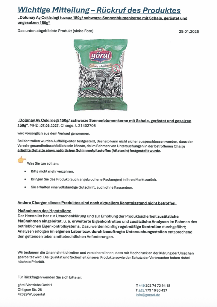 Türkiye'de üretilerek Almanya'ya ihraç edilen ve bu ülkede daha önce iki kez toplatılan Göral markalı ayçekirdekleri bir kez daha toplatılıy...