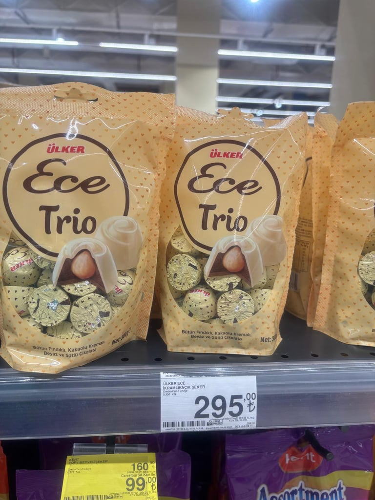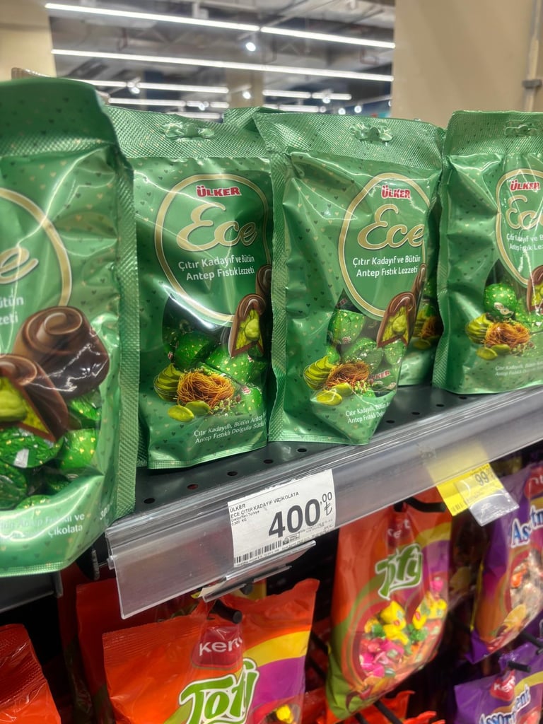 Tek paketi 400₺'den satışa sunulan Ülker Ece markalı çıtır kadayıflı ve Antep fıstıklı çikolata içeriğinde %5 oranında Antep fıstığı bulunuy...