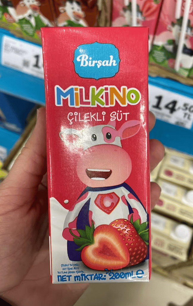 A101 mağazalarında çilek görselleri ve çocukların dikkatini çekecek çizgi karakterlerle satışa sunulan Milkino Çilekli süt içeriğinde %0,01 ...
