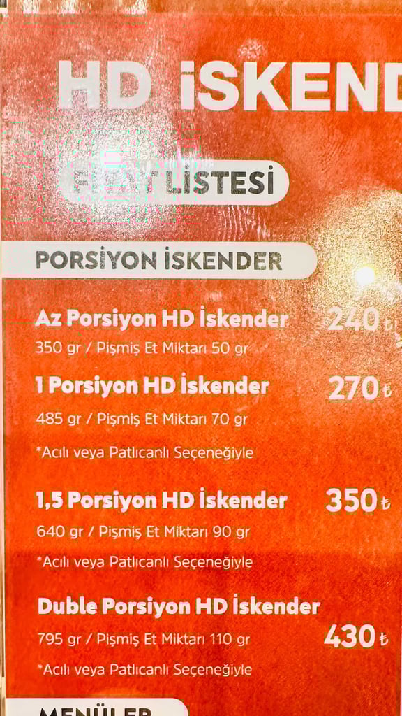 HD İskender firmasının iskender fiyatları 50 gr et içeren az porsiyon 240₺ 70 gr et içeren 1 porsiyon 270₺ 90 gr et içeren 1,5 porsiyon 350₺ Beyan edilen gramajlar ve tüketiciye sunulan fiyatlar sizce normal mi?