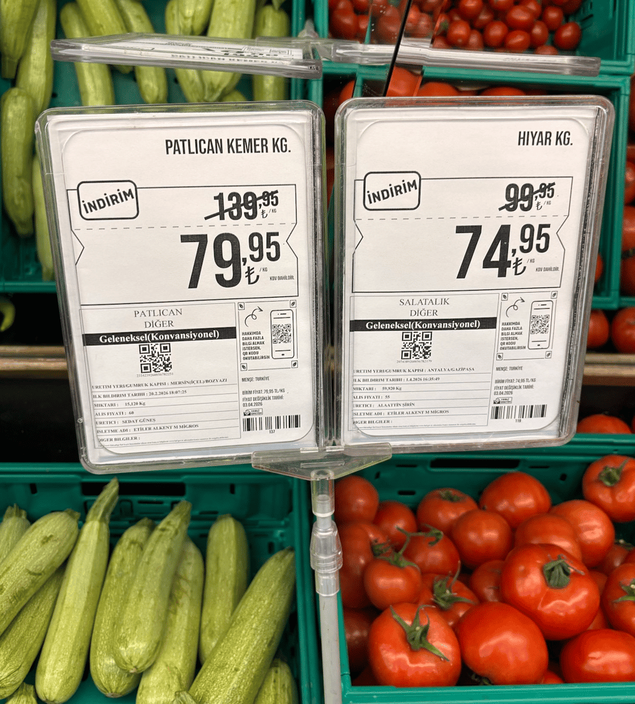 Buna göre; 139,95₺'ye satışa sunduğu patlıcanların fiyatını 79,95₺'ye düşürürken, 99,95₺'ye satışa sunduğu hıyarları da 74,95₺'ye indirdi.