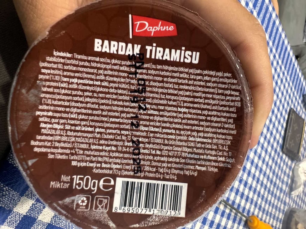 Tiramisu aromalı sos (su, glukoz şurubu, tam hidrojenize bitkisel yağ (palm çekirdeği yağı), şeker, stabilizörler (sorbitol şurubu, hidroksipropil metil selüloz, tara gam, jellan gam), emülgatörlar, asitlik düzenleyiciler (mono- ve diasetil tartarik asit esterleri, sodyum stearoil-2-laktilat (polisorbat 60), sodyum karboksimetil selüloz, tuz, renklendirici (beta karoten)), tam yağlı beyaz peynir (%10), tam yağlı pastörize inek sütü, asitlik düzenleyici (tri-sodyum fosfat), yağ asitlerinin mono- ve digiserlerinin (glukono-delta-lakton), peynir kültürü, tuz, renklendirici (beta karoten)), tam hidrojenize bitkisel yağ (palm), modifiye mısır nişastası, peyniraltı suyu tozu (sıft), glukoz şurubu (mısır), potasyum sorbat), koruyucu (potasyum sorbat), tiramisu aroma vericiler (vanilya-çikolata), kahve aromaları, sodyum stearoil-2-laktilat), yağ asitlerinin mono ve digiserlerinin emülgatörler, yağ asit esterleri (sodyum karboksimetil selüloz (%2,8), kabartıcılar (disodyum difosfat, sodyum hidrojen karbonat), buğday nişastası, emülgatör (polisorbat 60)), aroma verici (kahve, %1), aroma verici (kahve) asit (tartarik asit), koyulaştırıcı (potasyum sorbat), çözünebilir kahve (%1), tuz, koruyucu (potasyum sorbat), jelleştirici (pektin), asitlik asit, nem vericiler (sorbitol), şeker, kakao tozu (%2), kakao aroma verici, yağ azaltılmış kakao tozu