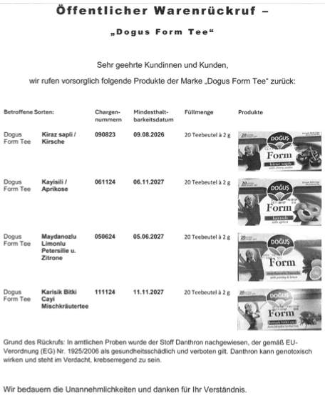 Doğuş Çay markası altında satılan form çayı ürünlerinin dört farklı çeşidi için Almanya'da acil geri çağırma kararı alındı. Kamuoyuna yapılan duyuruda, ürünlerin belirli partilerinde insan sağlığı için tehlikeli ve yasaklanmış Dantron maddesi tespit edildiği belirtildi. Bu nedenle, tüketicilerin güvenliği amacıyla zorunlu bir tedbir olarak ilgili ürünlerin piyasadan toplatılmasına başlandı. Yetkililer, tüketicileri ellerindeki ürünleri kontrol etmeleri ve kesinlikle tüketmemeleri konusunda uyardı. Yasaklı madde tespit edilen ürünlerin parti numaraları ise Almanya Gıda Bakanlığı tarafından kamuoyuna duyuruldu.