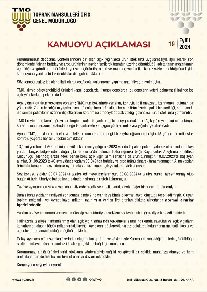 Önceki günlerde milletvekili Turhan Çömez tarafından ortaya atılan “Tarım ve Orman Bakanlığı’nın birçok ilde açtırdığı çukurlara binlerce ton buğday gömdüğü” iddiasıyla ilgili kurumlar ve sivil toplum kuruluşları tarafından açıklama yapıldı. Bazı basın yayın organlarında ve sosyal medyada yapılan yayınlarda Ukrayna’nın Türkiye’den İHA/SİHA satın alırken ödemeyi buğday ile yaptığı ve bu olağanüstü alım sebebiyle fazlalık buğdayın toprak altına gömüldüğü iddialarıyla ilgili konuşan milletvekili Turhan Çömez; “Bunları mecburen aldılar ancak bunu TMO silolarına koyamadılar. Nereye koyduğunu biliyor musunuz, bir naylon serip toprağa gömdüler. Adres veriyorum size Bandırma'nın Merinos çiftliğinin bahçesi, gidin bu akşam toprağa gömülmüş 100 küsür bin ton buğday göreceksiniz.” ifadelerini kullanmıştı.
