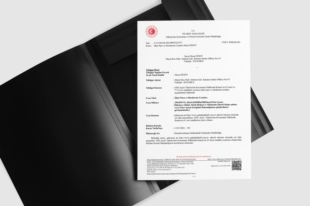 Ticaret Bakanlığı kestiği cezaya dayanak olarak tek bir cümlenin tam 36 ayrı maddesine aykırılık içerdiği iddiasında bulunmuştu. Bu haliyle bakanlık “yüksek oranda protein içerir” ifademizin; Belirsiz, yanlış ve yanıltıcı olduğunu, Diğer ürünlerin güvenilirliğini şüpheye düşürdüğünü, Bu ürünün aşırı tüketimini özendirdiğini, Tüketilmediği takdirde sağlığı olumsuz etkileyebileceğini ileri sürdüğünü, Gıdanın sahip olmadığı özelliklere atıfta bulunduğunu, Kamu sağlığını bozucu nitelikte olduğunu, Tüketicinin bilgi eksikliğini istismar ettiğini, Tüketiciyi yanılttığını, Can ve mal güvenliğini tehlikeye düşürdüğünü, Kamu sağlığını bozduğunu ve Doğru ve dürüst olmadığını iddia etmişti. Tek bir cümle üzerinden suç atfedilen bu maddeler ve fazlasından dolayı da en üst sınırdan Gıda Dedektifi’ne orantısız bir ceza kesilmişti.