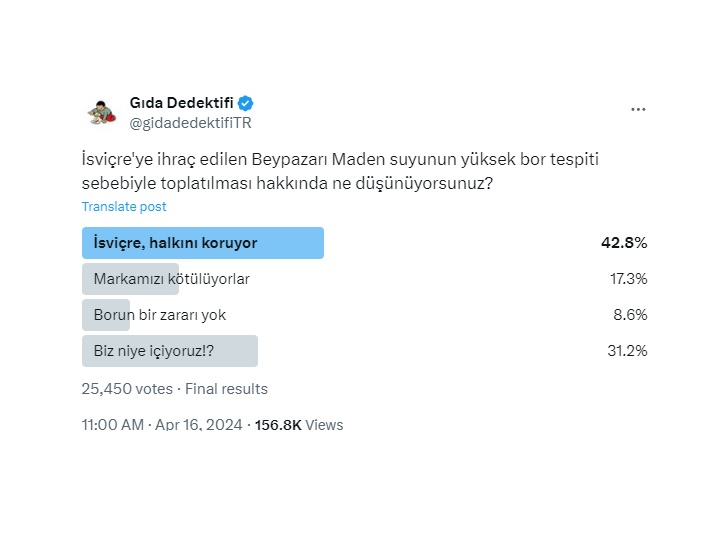 “İsviçre’ye ihraç edilen maden suyunun yüksek bor tespiti sebebiyle toplatılması hakkında ne düşünüyorsunuz?” sorusunun yönetildiği ankette katılımcıların %42,8’i yani 10.892 kişi “İsviçre, halkını koruyor” cevabını verdi. Ankette benzer şekilde %31,2 oranında da “Biz niye içeriyoruz?!” cevabı yer aldı. Özellikle son dönemde Avrupa’dan dönen tonlarca ürünümüzün yanında maden suyunda da böyle bir toplatma kararının çıkması, dönen ürünlerin iç piyasada Türk halkına yediriliyor ve içiriliyor olması muhtemelen bu tepkinin bu denli yüksek olmasına sebep oldu. Diğer yandan Avrupa’da uygunsuz gıdaya yönelik bu denli sert ve disiplinli regülasyonlar uygulanırken, Türkiye’de konuyla ilgili yeterli denetim yapılmaması, yapılan denetimlerin veya uygulanan yaptırımların kamuoyuyla paylaşılmaması da bu tepkilerin artmasına sebep oldu.