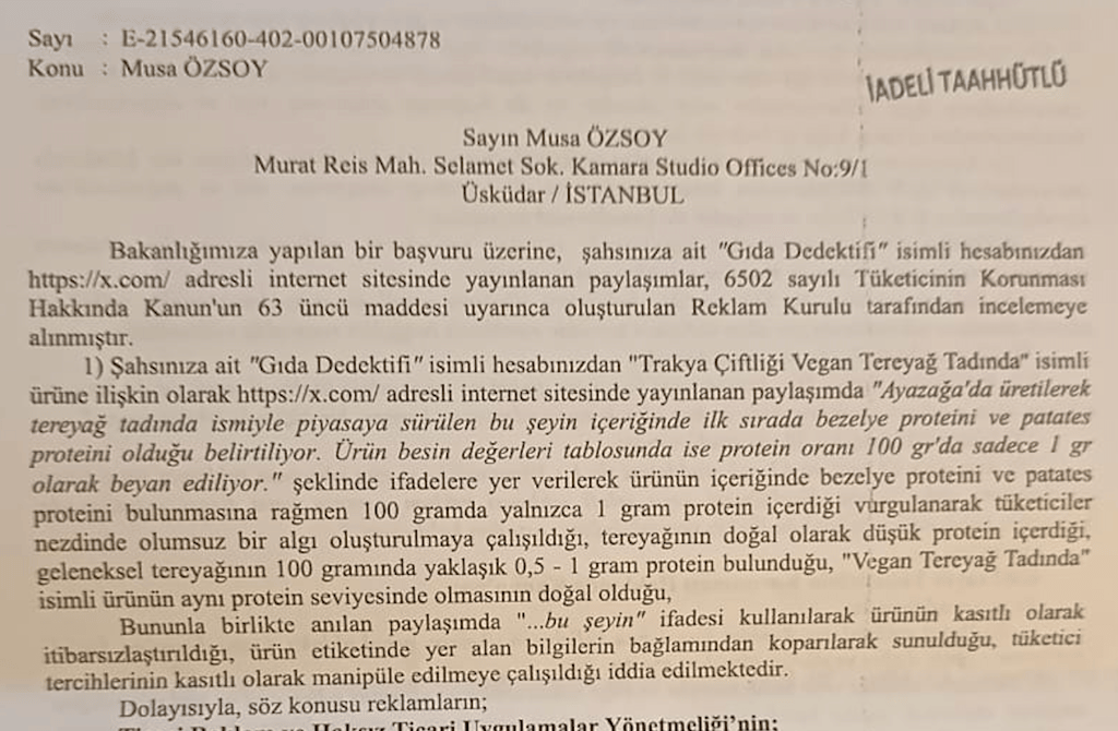 Gıda Dedektifi sosyal medya hesabında geçtiğimiz aylarda yapılan bir paylaşımın Ticaret Bakanlığı tarafından soruşturma konusu olduğu duyuruldu. Kendisine yapılan tebligat sonrasında bugün sosyal medya hesabından açıklama yapan Gıda Dedektifi yöneticisi Musa Özsoy, Trakya Çiftliği isimli bir markanın ürününe yönelik bir paylaşımında hiçbir suç unsuru olmadığı, olumsuz algı oluşturulmadığı ve içerik beyanıyla besin değerleri tablosundaki beyanların çelişkisinin konu edilerek tüketicinin bilinçlendirilmesinin amaçlandığını vurguladı. Söz konusu paylaşım, içeriğinde ilk sırada bezelye proteini ve patates proteini yer almasına rağmen 100 gramda sadece 1 gram protein içeren bir üründeki içerik beyanındaki tutarsızlığa dikkat çekiyor.