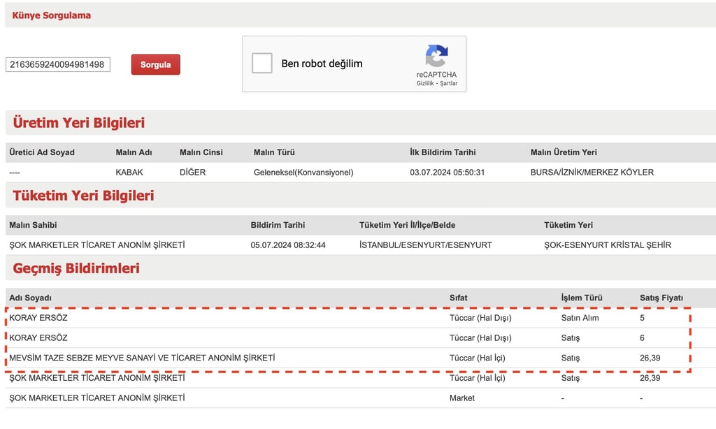 HKS künye numarası sorgulanarak Ticaret Bakanlığı nezdindeki veriler incelendiğinde bu ürünlerin aslında Koray Ersöz isimli tüccar tarafından üreticiden 5₺'ye alındığı ve 6₺'ye Mevsim Taze Meyve Sanayi A.Ş. firmasına satışının yapıldığı anlaşılıyor.