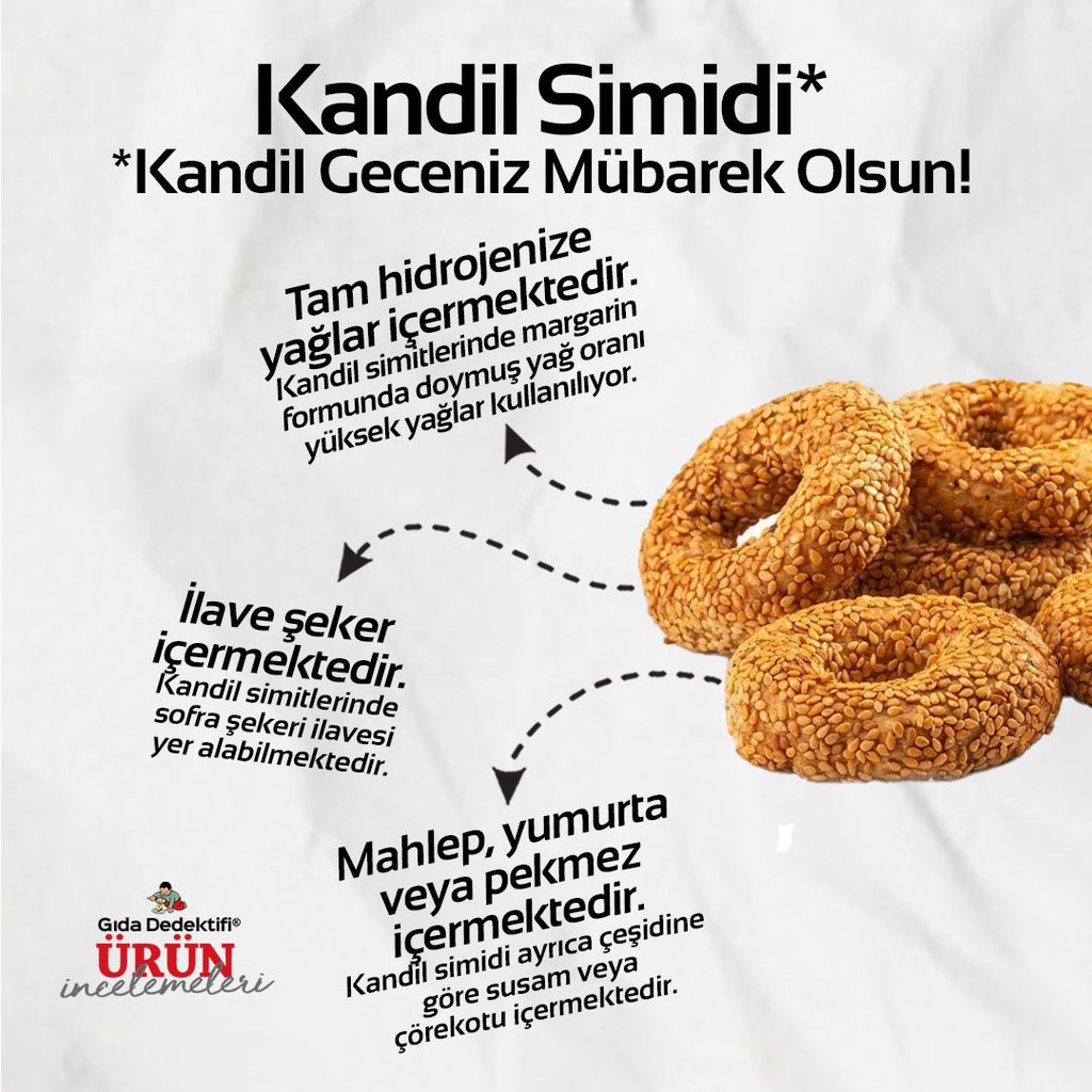 Özellikle kandil gecelerinde geleneksel olarak tüketilen ürünlerden biri de artık neredeyse her markette, pastanede ve kafede gördüğümüz kandil simididir. Kandil simidi tanesi yaklaşık 30-35 gr. ağırlığında atıştırmalık bir unlu üründür. Kandil simidinin çeşidine göre susamlı veya çörekotlu çeşidi bulunmaktadır. İçeriğinde mahlep ve yumurta olması kandil simidini diğer simitlerden ve unlu mamullerden farklı kılmaktadır. Sizler için içerik ve besin değerleri bilgisine rastladığımız bir kandil simidini – temsilen inceliyoruz.