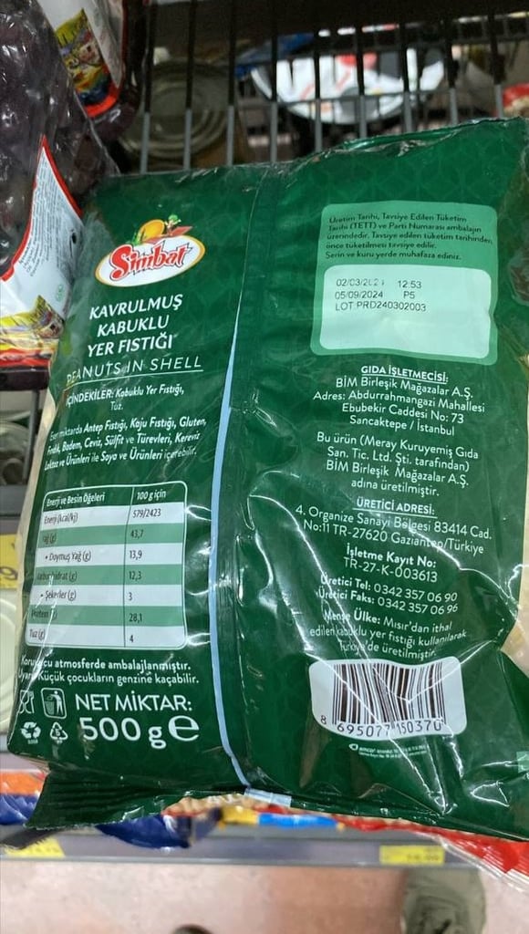 Takipçimizin gönderdiği fotoğrafta Simbat markasıyla satışa sunulan kavrulmuş kabuklu yer fıstığının etiketinde “Mısır’dan ithal edilen kabuklu yer fıstığı kullanılarak Türkiye’de üretilmiştir” ifadesi yer alıyor. 500 gr’lık paketler halinde satışa sunulan ürünün önceki ay Mısır’dan ithal edilerek Meray Kuruyemiş Gıda San. Tic. Ltd Şti. tarafından kavrulup, tuz eklenip fason olarak üretildiği anlaşılıyor.