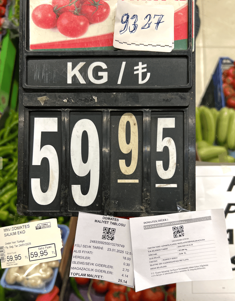 Ardından bu domatesleri satın alan Happy Center ise işletme, sevk giderleri ve mağazacılık giderleriyle birlikte bu ürünün maliyetinin 25 ₺ olduğunu beyan ediyor. Fakat göz göre göre 2,5 kata yakın kar ekleyip bu domatesleri 59,95₺ fiyatla tüketiciye sunuyor.