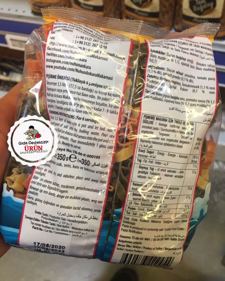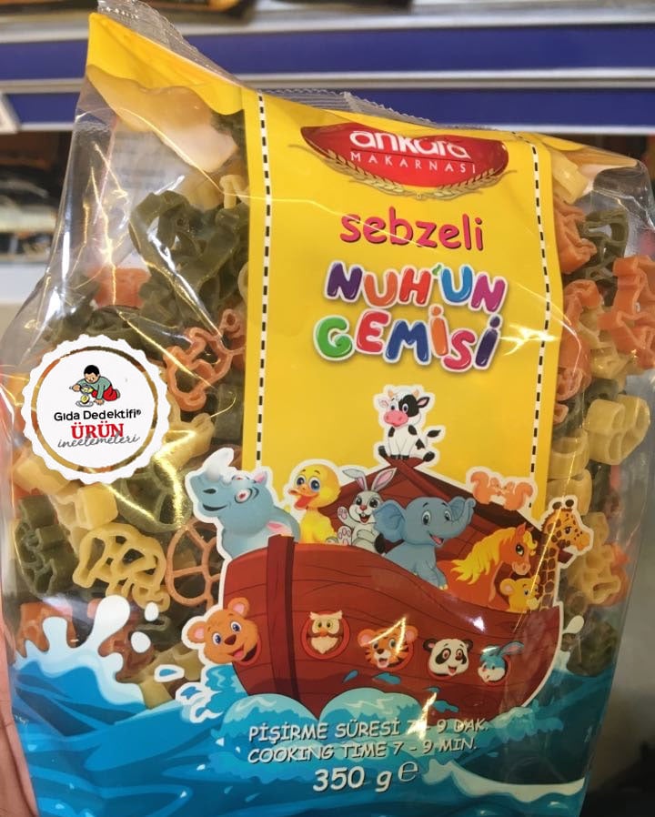 Özellikle çocukların çok dikkatini çeken ve severek yedikleri bir ürünü inceleyeceğiz; Nuh’un Ankara Sebzeli Nuh’un gemisi makarnası. Ürün içeriğindeki domates ve ıspanak ile renklendirilerek hayvan şekli verilmiş bir makarna.Türkiye’nin en eski makarna üreticilerinden Nuh’un Ankara markasıyla üretilen bu makarnada ilave katkı maddesi veya renklendirici bulunmuyor. Ürün 350 gr.’lık paketlerde satılıyor.