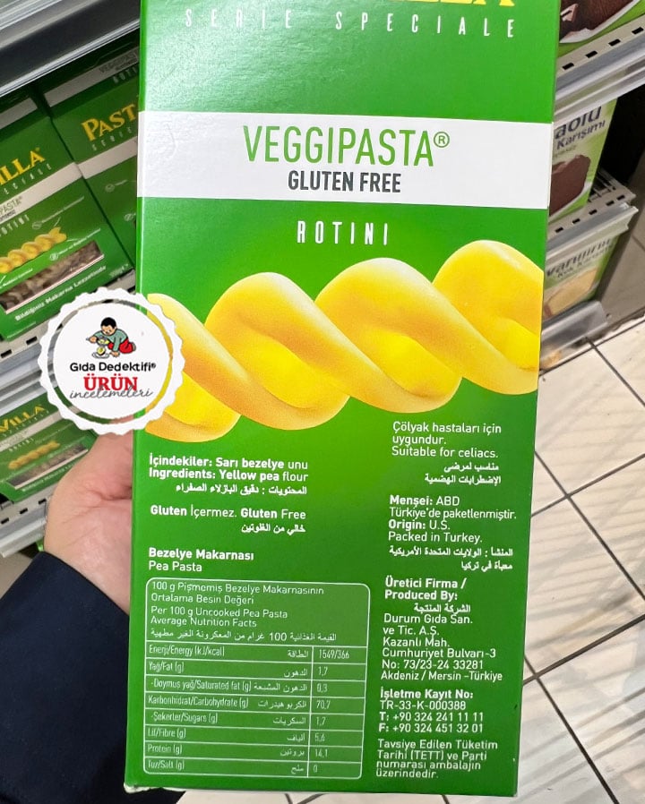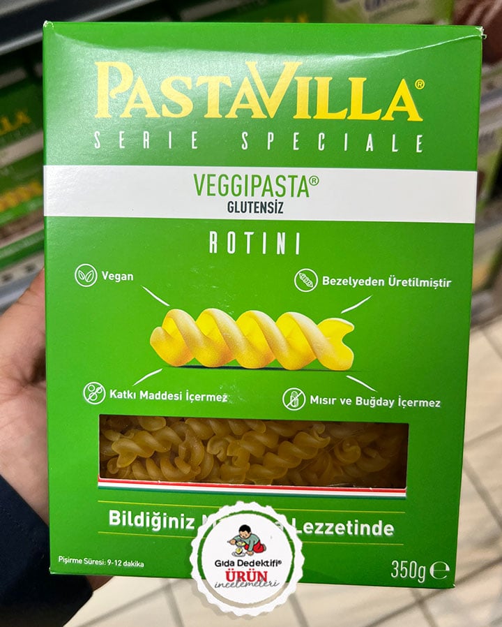 Pastavilla markasıyla glutensiz ürün reyonlarında dikkatimizi çeken bir ürünü inceleyeceğiz; VeggiPasta Glutensiz Rotini. 350 gr’lık paketlerde satışa sunulan ürün ambalajının ön yüzünde “bildiğiniz makarna lezzetinde”, “mısır ve buğday içermez” ve “bezelyeden üretilmiştir” ifadeleri dikkat çekiyor. Ürünün etiket bilgilerinden ABD’de üretilerek ülkemizde ithal edildiği ve Durum Gıda Sanayi ve Ticaret A.Ş. tarafından Türkiye’de paketlenerek satışa sunulduğu anlaşılıyor. Ürünün ayrıca “çölyak hastaları için uygundur” ibaresiyle satıldığını özellikle belirtmek gerekiyor.