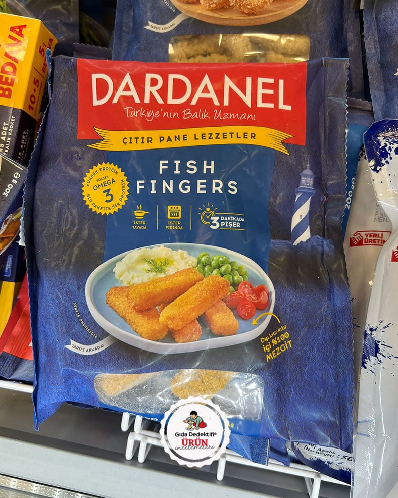 Dardanel markasıyla marketlerin derin dondurulmuş ürün dolaplarında yer alan Fish Fingers ürünlerini inceleyeceğiz. Ürün 400 gr’lık poşetlerde satışa sunuluyor ve içinde yaklaşık 10 tane balık kroket bulunuyor. Ürünün ambalajının ön yüzünde sağlıklı bir tabağa konulmuş 5 adet balık kroketin yanı sıra, “Yüksek Omega-3”, “Yüksek protein” ve “Bir pakette 55 gr protein” ifadeleri dikkat çekiyor. Ürünün ithal edilen balıklarla Çanakkale’deki Dardanel tesislerinde üretildiği anlaşılıyor.