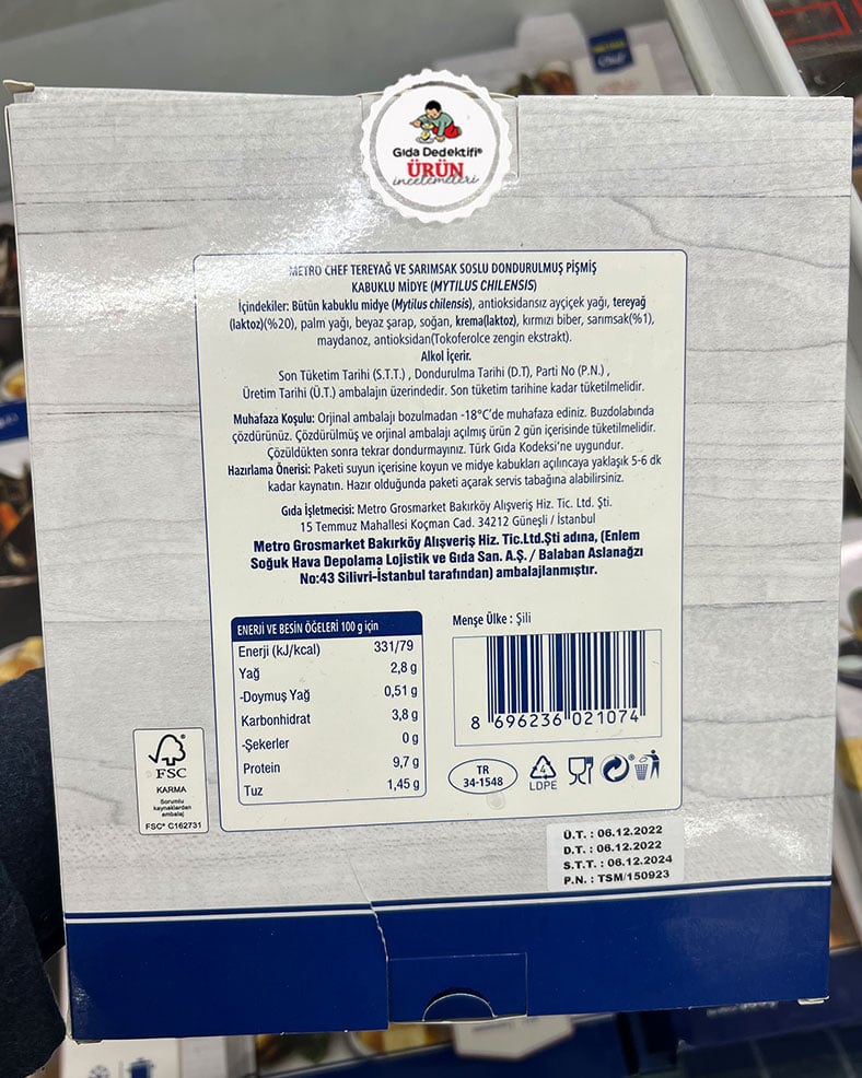 Genellikle lokanta, restoran ya da kafe gibi işletmelerin yoğun olarak alışveriş yaptığı Metro Gross marketlerde satışa sunulan dondurulmuş ürünlerden birini inceleyeceğiz: Metro Chef Tereyağlı ve Sarımsaklı Dondurulmuş Kabuklu Midye. Ürün 500 gr’lık paketlerde satışa sunuluyor ve içeriğinde 40 ila 60 adet kabuklu midye bulunduğu beyan ediliyor. Şili’den ithal edilerek Metro Grossmarket işletmesi için Enlem Soğuk Hava Depolama firması tarafından paketlendiği anlaşılan ürünün hala raflarda olmasına rağmen aslında 6 Aralık 2022 tarihinde üretilerek paketlendiği ve yaklaşık 2 ay sonra tüketim tarihi sona ereceği anlaşılıyor.