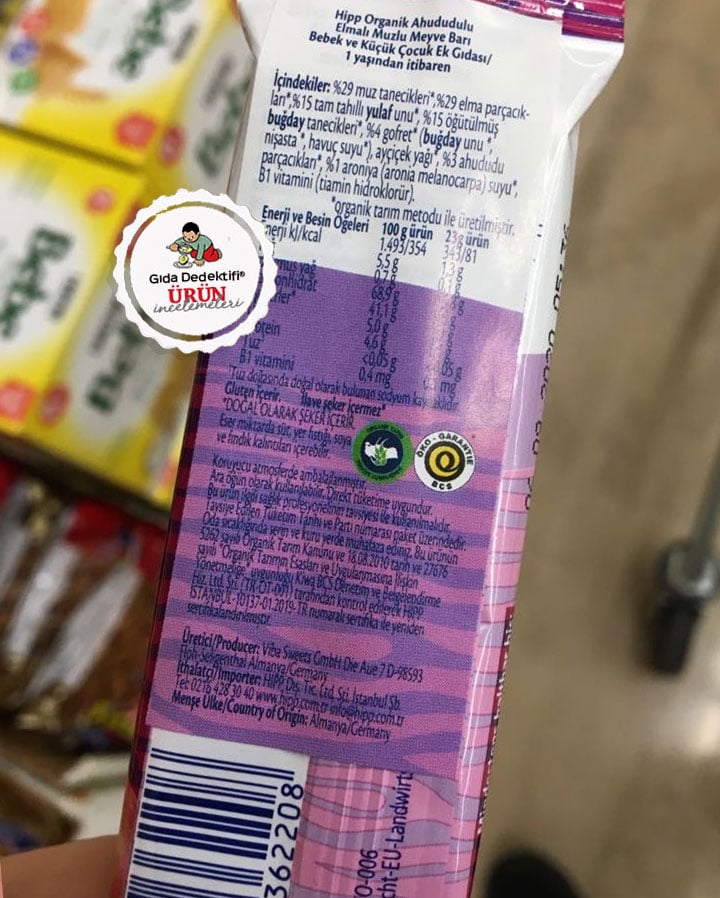 Bebek ve çocuklara yönelik organik ürünlerden birini daha inceleyeceğiz; Hipp Organik Ahududulu Elmalı Muzlu Meyve Barını inceleyeceğiz. Ürün 23 gr.’lık paketlerde satılıyor. Ürün tamamen organik bileşenler içeriyor. Ürün Hipp Türkiye tarafından Almanya üretilerek ithal ediliyor.