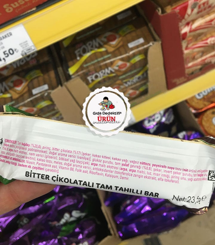 🔎İçindekiler: Tam buğday (%20,6), Bitter çikolata (%17) [Şeker, Kakao kitlesi, Kakao yağı, Yağsız süttozu, Peyniraltı suyu tozu, Emülgatör (Soya lesitini, Poligliserol polirisinoleat), Doğal aroma verici (Vanilya)], Glikoz şurubu, Tam yulaf gevreği (%8,6), Şeker, İnvert şeker şurubu, Tam buğday unu (%4,9), Arpa maltı ekstresi, Nem verici (Gliserol), Bitkisel yağ (Ayçiçek), Tuz, Mısır irmiği, Pirinç unu, Yağı azaltılmış kakao tozu, Emülgatör (Ayçiçek lesitini), Kakao tozu, Melas, Doğal aroma verici, Antioksidanlar (Tokoferolce zengin ekstrakt, Alfa-tokoferol), Vitamin ve Mineraller (Niasin, Pantotenik asit, B6 vitamini, Folik asit, Riboflavin, Kalsiyum, Demir