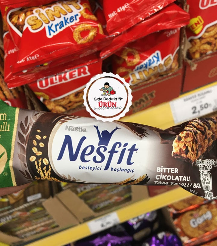 Nestlé tarafından uzun yıllardır üretilerek “fit” ibaresiyle satılan ve genellikle sağlıklı atıştırmalık imasıyla reklamları ve tanıtımları yapılan Nesfit markalı ürünün Bitter Çikolatalı Tam Tahıllı Bar çeşidini inceleyeceğiz. Ürün 23,5 gr.’lık paketlerde üzerinde “besleyici başlangıç” ve “tam tahıllı bar” ibaresi ile satılıyor. Ürünün Fransa’da üretilerek ülkemize ithal edildiğini belirtelim.