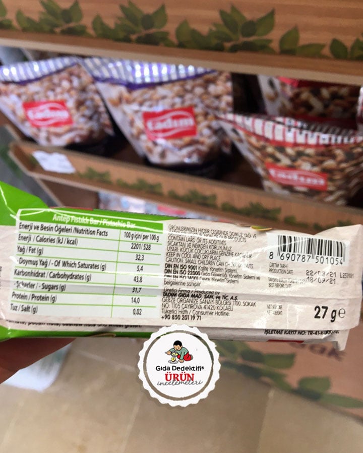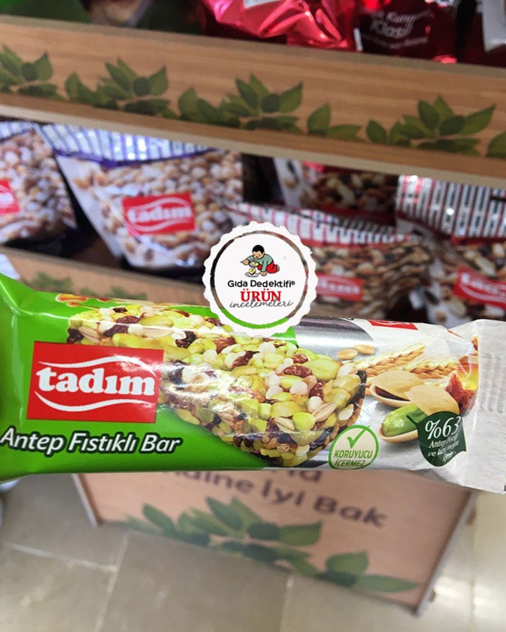 Önceki gün markette “Tadım’la kendine iyi bak” sloganlı özel bir reyonda satılan Tadım Bar ürünlerini gördük. Ürünleri yıllar önce içeriğinde glikoz şurubu ve maltodekstrin içeriğiyle farketmiş, sizlere aktarmıştık. Aradan geçen zamanda – bir de böyle bir stantta satılınca – belki içeriğinde olumlu değişimler olmuştur diye tekrar incelemeye aldık. Ürün 27 gr.’lık paketlerde satılıyor. Ürün ambalajında “Koruyucu içermez” ve “%63 Antep fıstığı ve kuru meyve içerir” ifadeleri dikkat çekiyor.