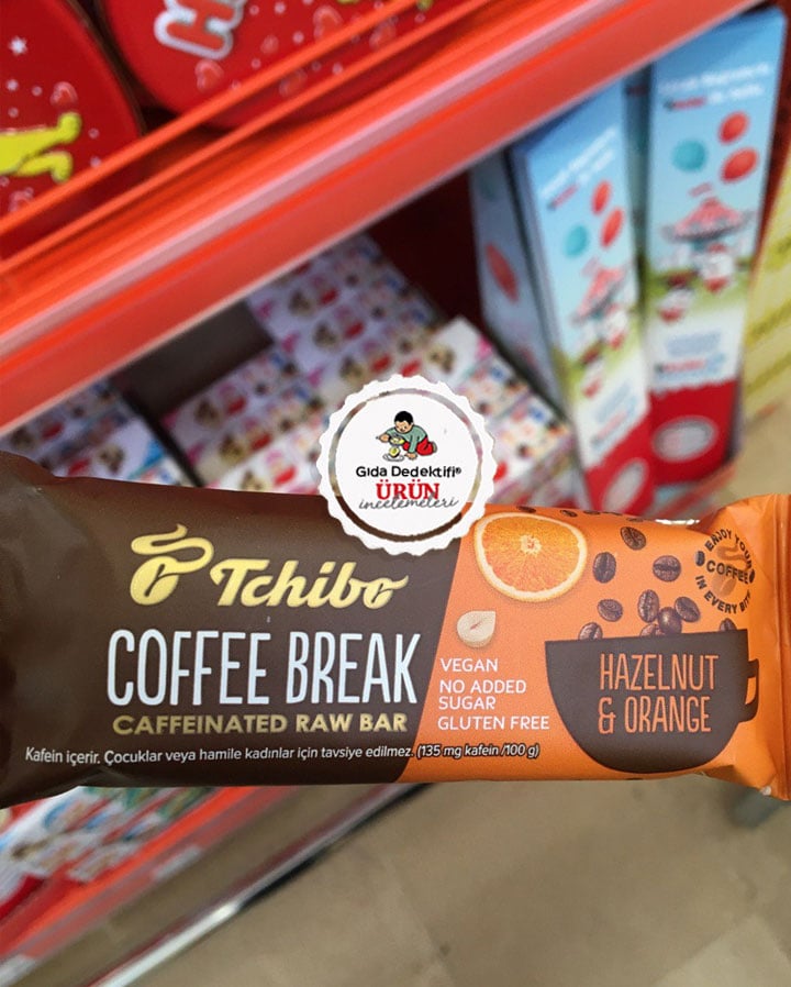 Önceki gün Migros marketlerde dikkatimizi çeken bir üründen bahsedeceğiz; Tchibo Coffee Break Fındık&Portakal. Birkaç farklı çeşidi daha bulunan ürün 40 gr.’lık paketlerde satılıyor. Kahveleriyle bilinen Tchibo markasıyla satılan bu ilave şekersiz barlar, içeriğinde öğütülmüş kahve içermesi yönünden farklı bir ürün olarak dikkat çekiyor. Ürünün Tchibo tarafından Pachamama Gıda firmasına fason olarak ürettirildiğini ve muhtemelen Tchibo tarafından tedarik edilen öğütülmüş kahvelerin kullanıldığını söyleyelim.