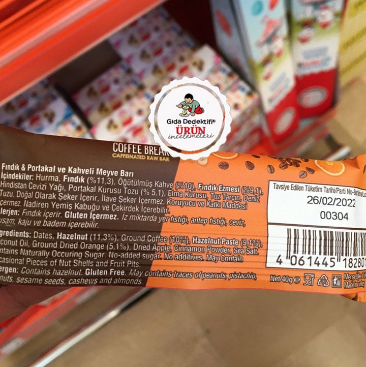 🔎İçindekiler: Hurma, Fındık (%11,3), Öğütülmüş Kahve (%10), Fındık Ezmesi (%9,1), Hindistan Cevizi Yağı, Portakal Kurusu Tozu (%5,1), Elma kurusu, Toz tarçın, Deniz tuzu.