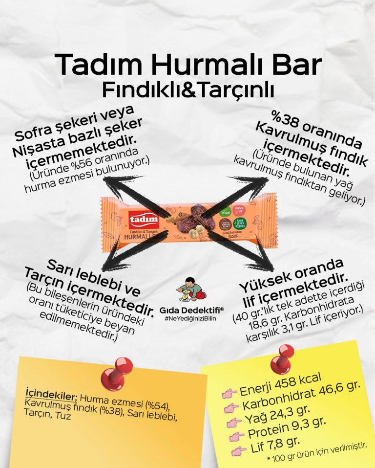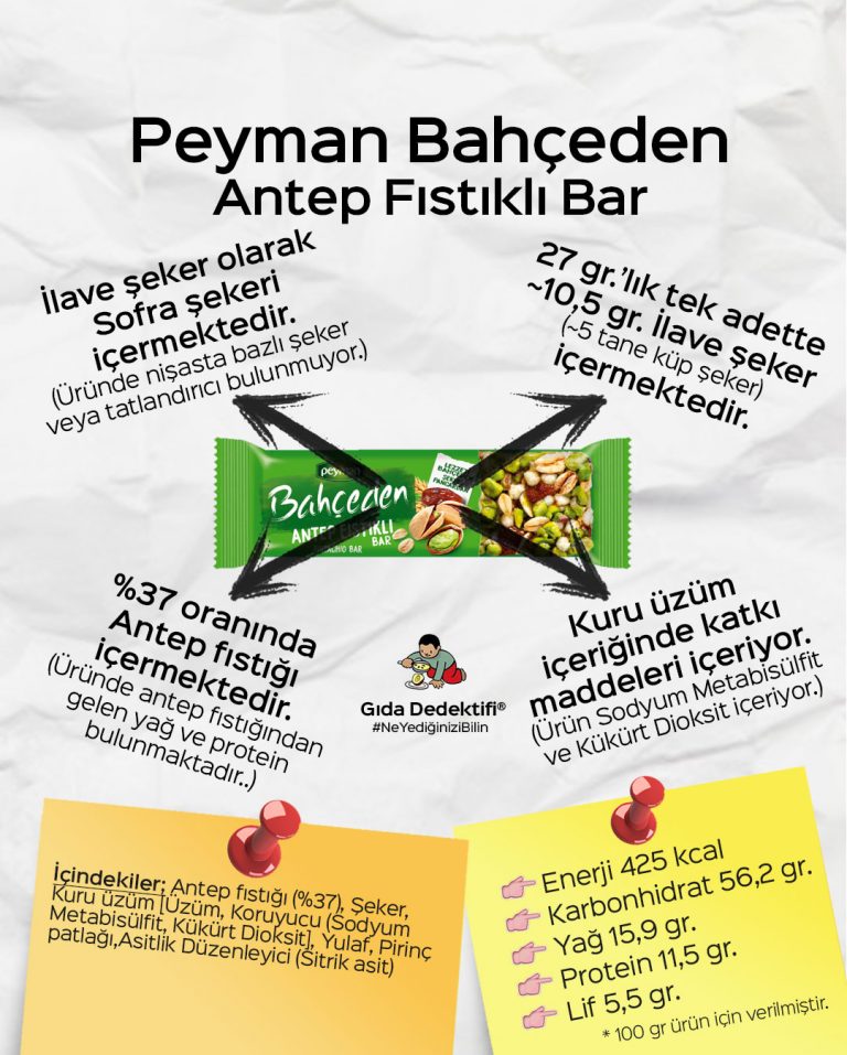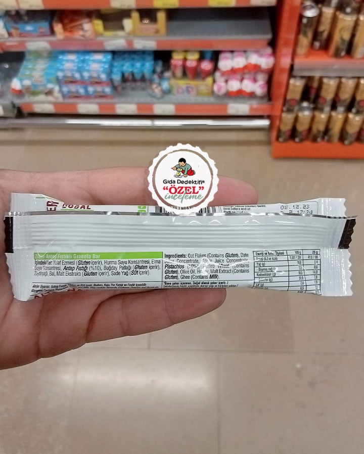 🔎İçindekiler: Yulaf ezmesi, Hurma suyu konsantresi, Elma suyu konsantresi, Antep fıstığı (%10), Buğday patlağı, Bitkisel yağ (Zeytinyağı), Bal, Malt ekstraktı, Sade yağ