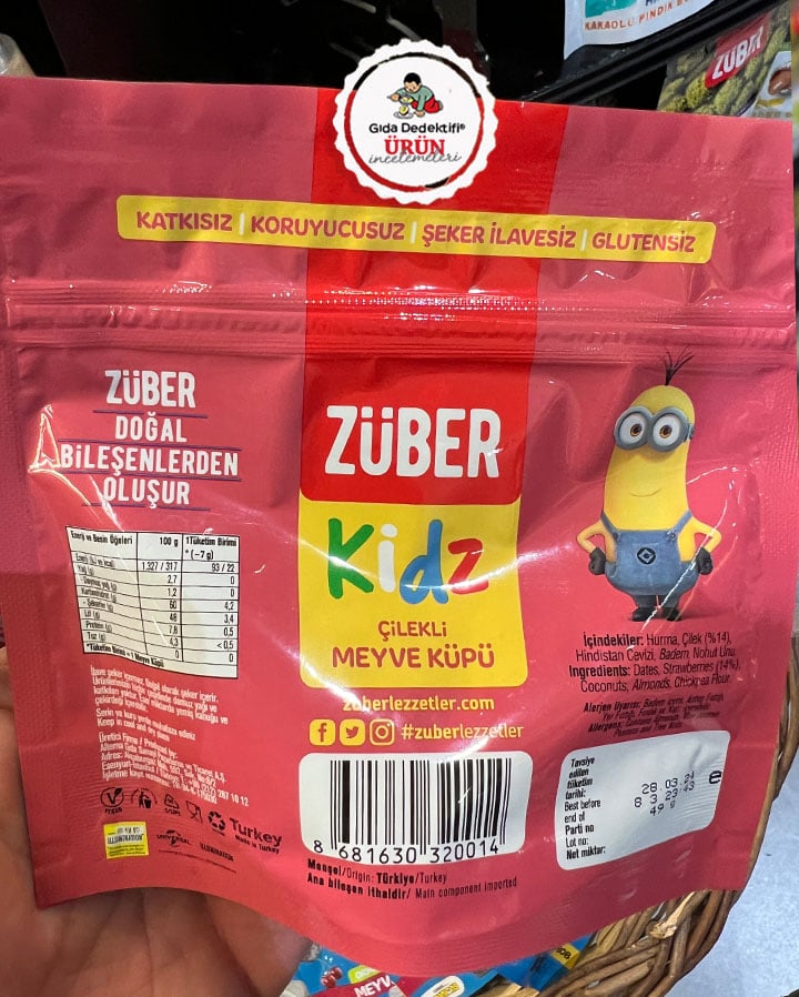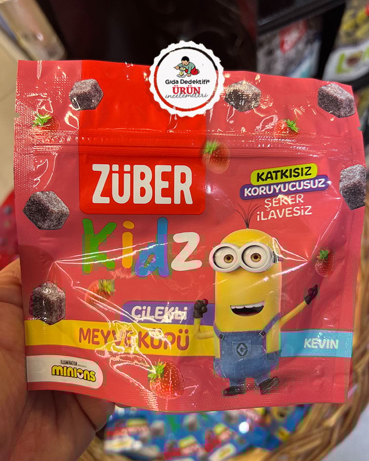 Türkiye’de ilave şekersiz ve katkısız atıştırmalık ürünlerini yaygınlaştıran ve her geçen gün çeşitliliğini arttıran Züber markasıyla piyasaya çıkan yeni bir ürünü inceleyeceğiz; Züber Kidz Çilekli Meyve Küpü. Ürün 49 gr.’lık paketlerde satılıyor ve ambalajında çocukların sevdiği Minions çizgi filmine ait çeşitli karakterler yer alıyor. Ürün içeriğinde ilave şeker, tatlandırıcı, aroma verici veya koruyucu herhangi bir katkı maddesi bulunmuyor.