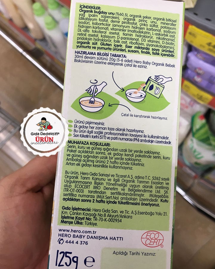 Marketlerde uzun yıllardır rastlanan bebek bisküvilerinin yanında artık bir süredir “organik” bebek bisküvileri de dikkat çekiyor. Raflarda rastladığımız organik bebek bisküvilerinden birini; Hero Baby markalı Organik Bebek Bisküvisi’ni inceleyeceğiz. Ürün 125 gr’lık paketlerde satışa sunuluyor. Ürün ambalajı üzerinde Türkiye Cumhuriyeti Organik Tarım logosu ve sertifikasyon kuruluşunun bilgisi yer alıyor. Bu haliyle ürünün TR-OT-003 sertifika numaralı EcoCert firması tarafından Organik sertifikası ile sertifikalandırıldığını belirtelim. Diğer yandan ürün ambalajında Menşei: Türkiye ifadesi dikkat çekiyor. Bununla birlikte üründe yer alan organik şeker, organik palm yağı vb. bileşenlerin de Türkiye’de üretildiği gibi bir anlam çıkıyor. Bu noktada firmanın ne denli doğru ve dürüst bir beyan yaptığı hususunda kafamız karışıyor.