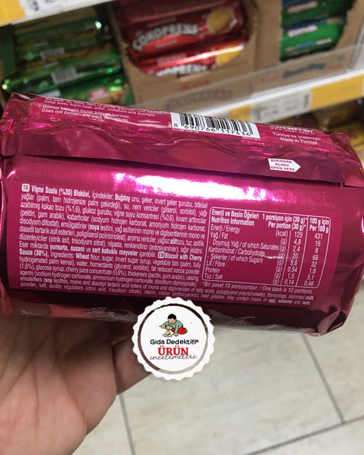 🔎İçindekiler: Buğday unu, Şeker, İnvert şeker şurubu, Bitkisel yağ (Palm, Tam hidrojenize palm çekirdeği), Su, Nem vericiler (Gliserol, Sorbitol), Yağı azaltılmış kakao tozu (%1,6), Glikoz şurubu, Vişne suyu konsantresi (%0,6), Kıvam arttırıcılar (Pektin, Gam arabik), Kabartıcılar (Sodyum hidrojen karbonat, Amonyum hidrojen karbonat, Disodyum difosfat), Emülgatörler (Soya lesitini, Yağ asitlerinin mono ve digliseritlerinin mono ve diasetil tartarik asit esterleri, Poligliserol polirisinoleat), Aroma vericiler, Yağsız süttozu, Tuz, Asitlik Düzenleyiciler (Sitrik asit, Trisodyum Sitrat), Nişasta, Renklendiriciler (Antosiyaninler), Sığır jelatini