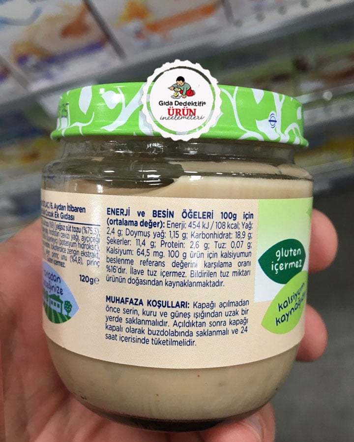 Üründe üçüncü sırada ise şeker yer alıyor. Üründeki şeker oranı net olarak ifade edilmiyor. Besin değerleri tablosundan anladığımız kadarıyla ürün 100 gr.’da 11 gr. şeker içeriyor – ki bunun çok azı sütten geliyor. Bu haliyle ürün tek kavanozda yaklaşık 13,2 gr. şeker bulunduğu hesaplanıyor. Üründe bu şeker yüküne karşılık lif oranı ise beyan edilmiyor. Ürün bu temel bileşenlerin yanı sıra; %4,8 oranında pirinç unu ve %1,5 oranında pirinç içermektedir. Üründe ayrıca %0,005 yani yüzbinde 5 oranında da tarçın bulunmaktadır.Bu haliyle “6. aydan itibaren tüketilebilir” ifadesi yer alan ürün 120 gr.’lık tek kavanozda yüksek oranda ilave şekerden gelen 129 kcal enerji veriyor. Ürün tek kavanozda 13,2 gr. şeker, 2,9 gr. yağ ve 3,12 gr. protein içeriyor. Üründe kalsiyum oranı ise 100 gr.’da 64,5 mg. olarak beyan ediliyor – ki bu da tek kavanozda 77,4 mg. kalsiyum içerdiğini gösteriyor. Hatırlatalım 120 ml. süt 144 mg. yani bu kavanozun iki katına denk oranda kalsiyum içermektedir. Anne sütünde ise çok daha fazlası ve yararlı bileşenler bulunmaktadır.