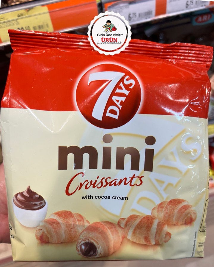 Euroleague sponsorluğuyla bilinen ve market raflarında kruvasan ürünleriyle dikkat çeken 7 Days markalı kakao kremalı mini kruvasan ürününe bakıyoruz. Farklı çeşit ve boyları satışta olan ürünün 185 gr’lık paketlerde satılan ve tanesi ortalama 28 grama denk gelen mini kruvasanları inceleyeceğiz. Ürünün Gebze’de faaliyet gösteren Mondelez Turkey firmasına ait Türkiye’deki tesislerde üretildiğini söyleyelim.