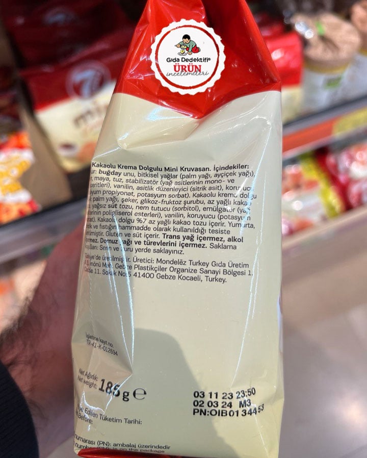 🔎İçindekiler: Hamur [Buğday unu, Bitkisel yağlar (Palm, Ayçiçek), Şeker, Maya, Tuz, Stabilizatör (Yağ asitlerinin mono ve digliseritleri), Vanilin, Asitlik Düzenleyici (Sitrik asit), Koruyucu (Kalsiyum propiyonat, Potasyum sorbat), Kakaolu Krema Dolgu (%34) [Bitkisel yağ (Palm), Şeker, Glikoz-fruktoz şurubu, Yağı azaltılmış kakao tozu, Yağsız süttozu, Nem tutucu (Sorbitol), Emülgatör (Yağ asitlerinin mono ve digliseritleri), Vanilin, Koruyucu (Potasyum sorbat)