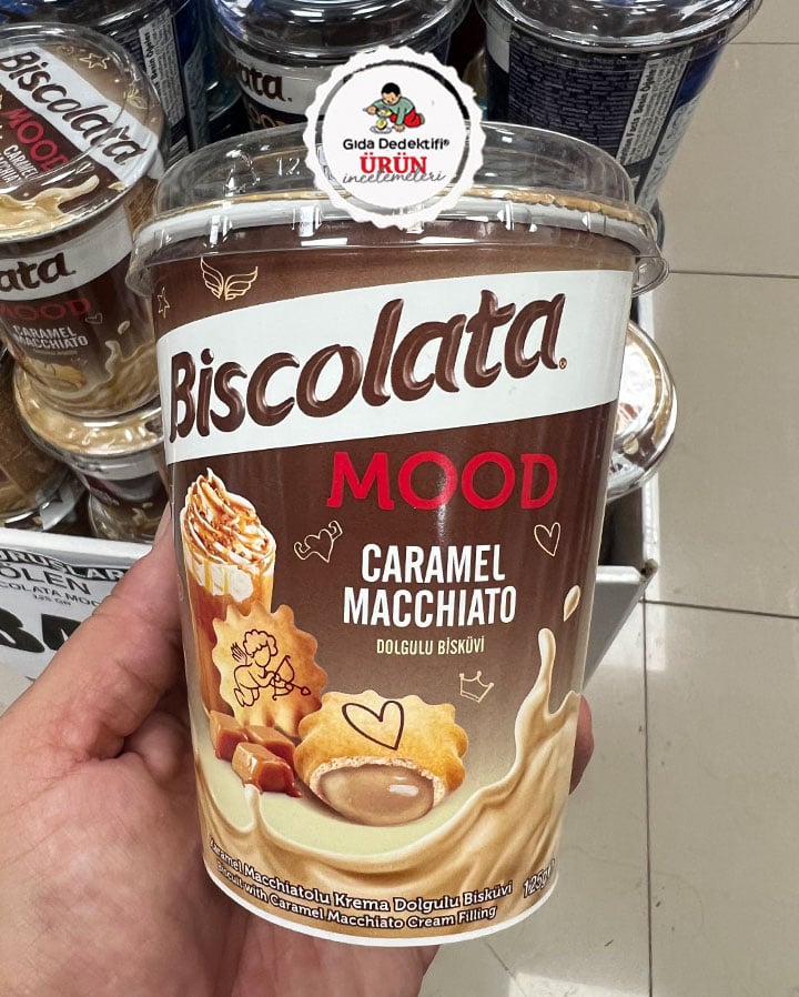 Gıda endüstrisi yıllardır yaptığı mühendislik çalışmaları kapsamında artık istediği her şeyin tadını, kokusu yapay ve kimyasal aroma vericilerle verebiliyor. Bugün üzerinde karamel görselleri bulunan Biscolata Mood Caramel Macchiato dolgulu bisküvi ürününü inceleyeceğiz. Ürün 125 gr’lık paketlerde satışa sunuluyor.