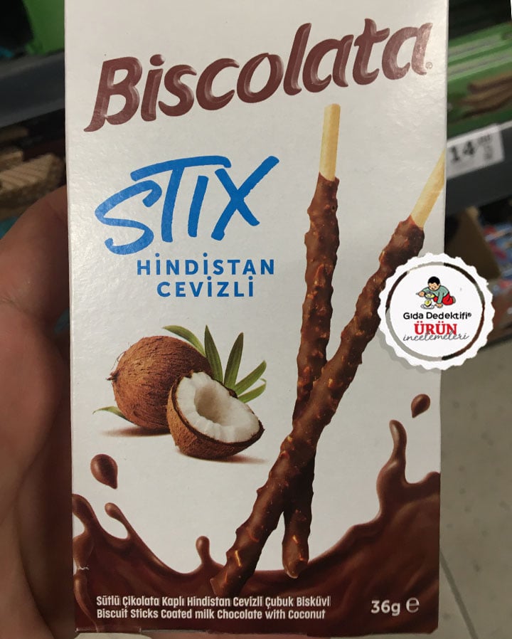 Şölen firması tarafından Gaziantep’te üretilerek “Biscolata” markasıyla tüm Türkiye’de ve yurtdışında piyasaya sürdüğü ürünlerden birini; Stix Hindistan Cevizli Çubuk Bisküvi ürününü inceleyeceğiz. Ürün 36 gr’lık paketlerde satılıyor. Ürünün özetle çikolata kaplı ve Hindistan cevizi içeren, tuzlu değil, şeker içerikli çubuk kraker – daha doğrusu bisküvi olduğunu söylemek gerekiyor.