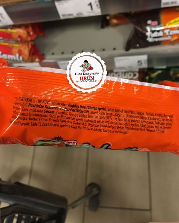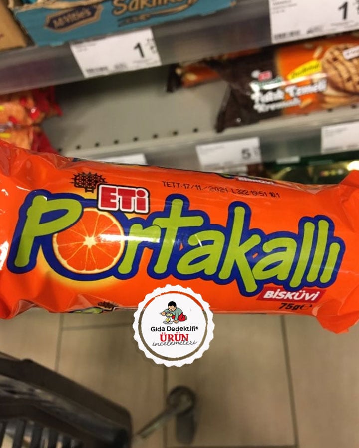 Çok uzun yıllar önce bakkal raflarından tanıdık gelen bir bisküvinin bugün üretilen yeni versiyonunu inceleyeceğiz; Eti Portakallı Bisküvi. Bugün içinde Palm yağı ile sofra şekerinin yanında invert şeker şurubu da bulunan bu ürün acaba o yıllarda neler içeriyordu? Ürünün geçmiş yıllardaki içeriği ve besin değerleri tabii ki firmalar tarafından açıklanmıyor fakat bugün marketlerde gördüğümüz ürünün bilgilerini tarihe not düşebiliyoruz. Ürün 75 gr.’lık ambalajlarda satılıyor.