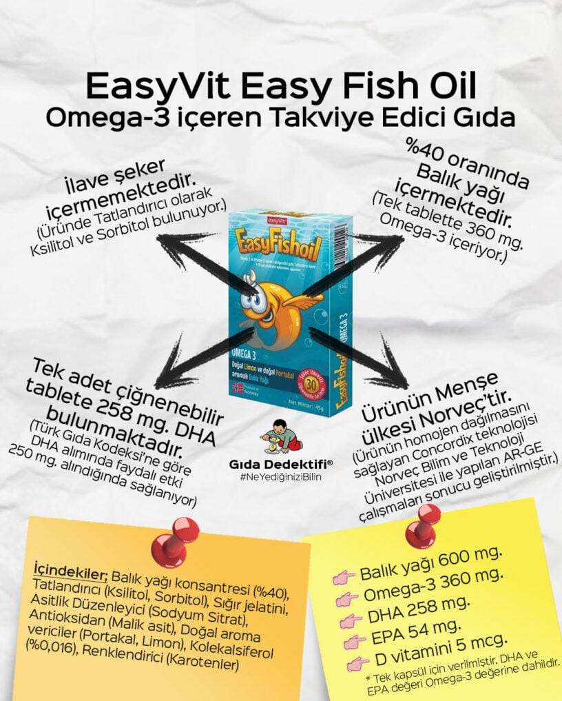 Ürün içeriğine baktığımızda ilk 3 sırada; bir bisküvinin temel bileşenleri olan Buğday unu, Şeker ve Bitkisel yağlar olduğunu görüyoruz. Üründe Bitkisel yağ olarak Eti ürünlerinde artık standart hale gelen Palm, Ayçiçek, Pamuk ve Kanola dörtlüsünün yer aldığını belirtelim. Ürün bunların yanında %3,3 oranında portakal püresi içeriyor. Üründe ayrıca içeriği bilinmeyen aroma vericiler bulunuyor – ki bunların arasında portakal aroma vericisi bulunduğunu tahmin etmek zor değil. Fakat bunun yanında bulunan yapay aromalar tüketiciye beyan edilmiyor.