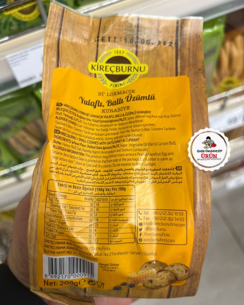 🔍İçindekiler: Buğday unu, Yulaf ezmesi (%27), Şeker, Bitkisel yağ (Palm), Kuş üzümü (%8), Tereyağ, Bal (%4), Tuz, Kabartıcı (Amonyum Bikarbonat, Sodyum bikarbonat)