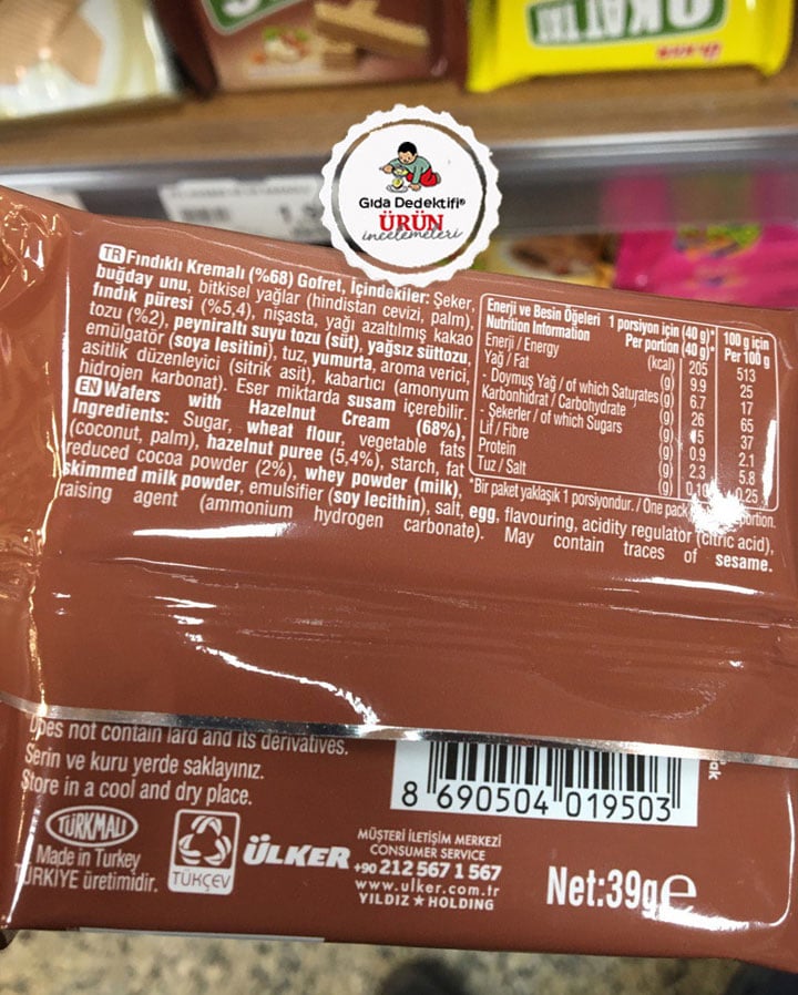 🔎İçindekiler: Şeker, Buğday unu, Bitkisel yağ (Hindistan Cevizi, Palm), Fındık Püresi (%5,4), Nişasta, Yağı azaltılmış Kakao tozu (%2), Peynir altı suyu tozu, Yağsız süttozu, Emülgatör (Soya Lesitini), Tuz, Yumurta, Aroma verici, Asitlik Düzenleyici (Sitrik asit), Kabartıcı (Amonyum Hidrojen Karbonat)