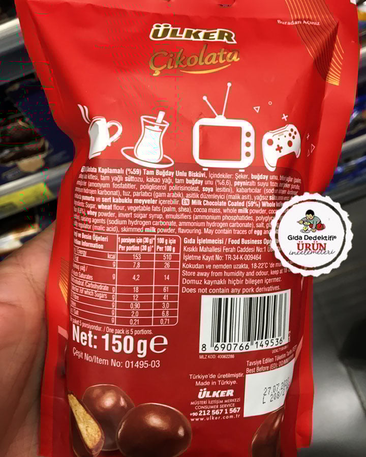 🔎İçindekiler: Şeker, Buğday unu, Bitkisel yağlar (Palm, Shea), Kakao kitlesi, Tam yağlı süttozu, Kakao yağı, Tam buğday unu (%6,6), Peyniraltı suyu tozu, İnvert şeker şurubu, Emülgatörler (Amonyum fosfatidler, Poligliserol polirisinoleat, Soya lesitini), Kabartıcılar (Sodyum Hidrojen Karbonat, Amonyum hidrojen karbonat), Tuz, Parlatıcı (Gam arabik), Asitlik düzenleyici (Malik asit), Yağsız süttozu, Aroma verici