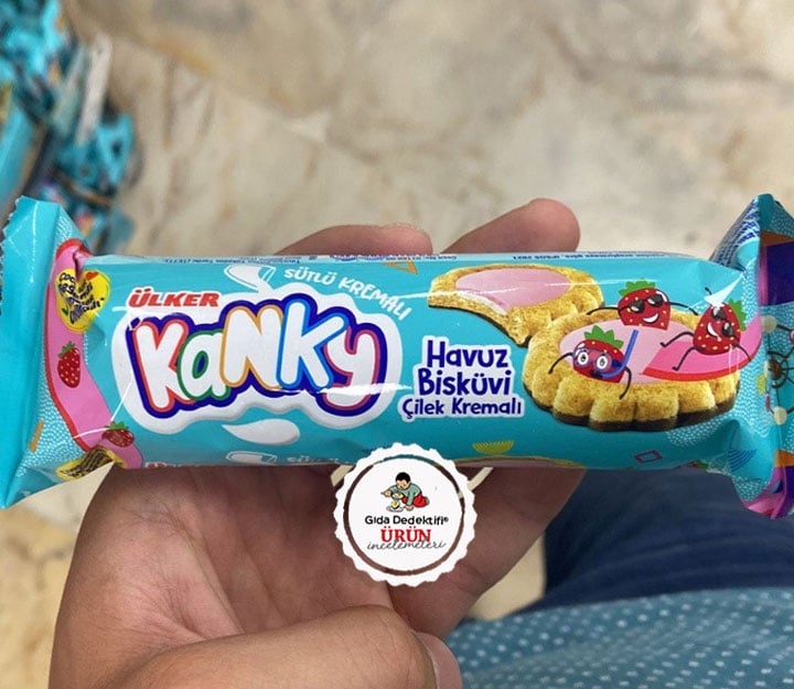 Ülker’in son dönemde influencer hesaplara hediye ürün göndermek suretiyle reklamını yaptığı ürünlerden Ülker Kanky Çilek Kremalı Havuz Bisküvi çeşidini inceleyeceğiz. Ürünün hediye olarak gönderildiği influencerlara iletilen mektup şu sözlerle başlıyor; “Sizi yeni çocuk atıştırmalık markamız Kanky ile tanıştırmak istiyoruz. Ülker Kanky geniş ürün portföyü, yenilikçi formatları ve rafta ayrışan turkuaz renkli, eğlenceli ambalajlarıyla karşınızda!” Bu giriş cümlesinden ürünün çocuklara yönelik üretildiği ve ayrıştığı noktanın ise içeriği değil, ambalajının rengi olduğu anlaşılıyor. Fakat çocuklara yönelik üretilen bu ürünün Sağlık Bakanlığı’nın çalışmaları doğrultusunda kantinlerde satışı yasaklı kategoride olduğunu belirtmek gerekiyor.