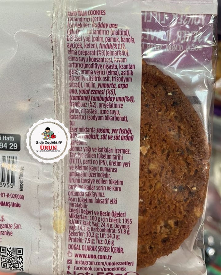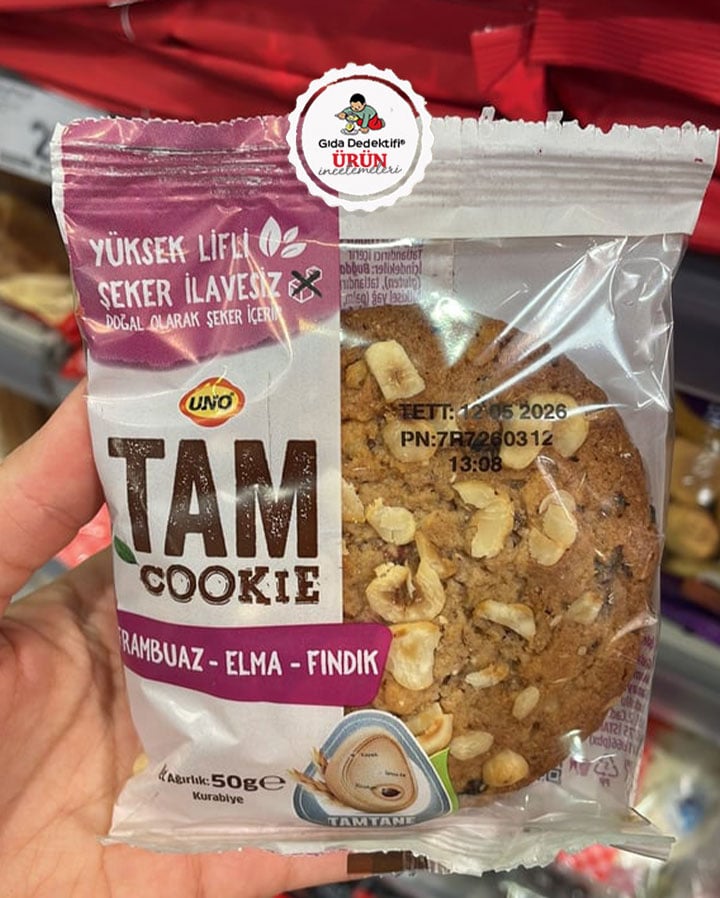 Market reyonlarında atıştırmalık raflarında dikkatimizi çeken bir ürünü inceleyeceğiz: Uno Tam Cookie. Frambuaz, Elma ve Fındık ibareleriyle satılan ve ambalajındaki şeffaf kısımdan kurabiye üzerindeki fındık parçacıkları da görülen ürün 50 gr'lık paketlerde satışa bulunuyor. Ürün ambalajında ayrıca "Yüksek Lifli", "Şeker İlavesiz" ve "Doğal olarak şeker içerir" ifadeleri dikkat çekiyor. Üründe ayrıca "Tatlandırıcı içerir" uyarısı da yer alıyor. Ürünün üzerindeki "Tamtane" logosuyla tam tahıl içeriği vurgulanırken, ambalajda frambuaz, elma ve fındık görselleri dikkat çekiyor. Ürünün Uno markasıyla MAŞ Unlu Mamülleri firmasına ait Manisa Organize Sanayi tesislerinde üretildiği anlaşılıyor.