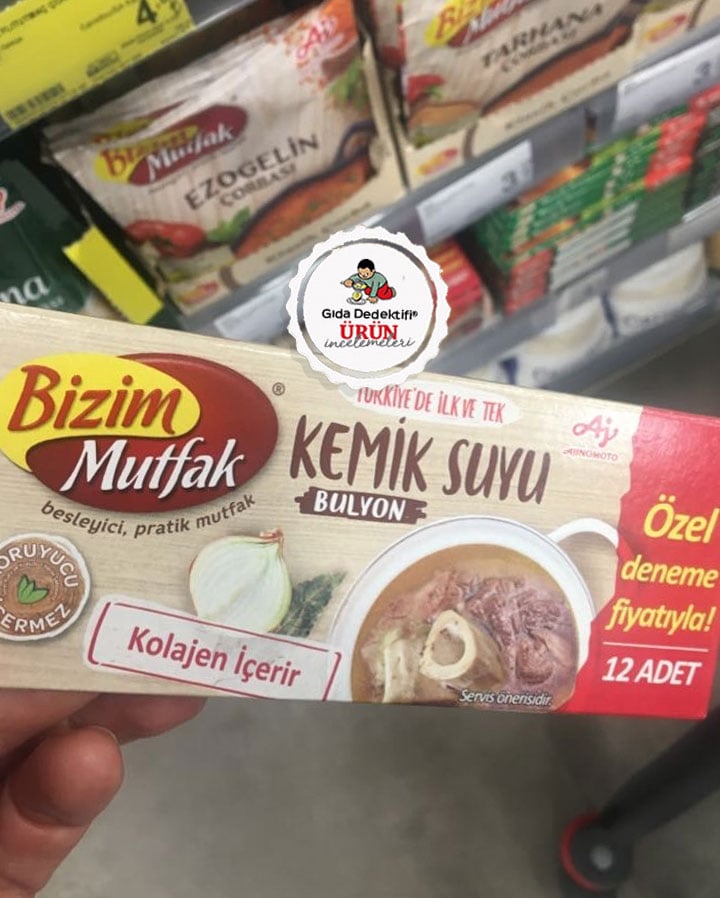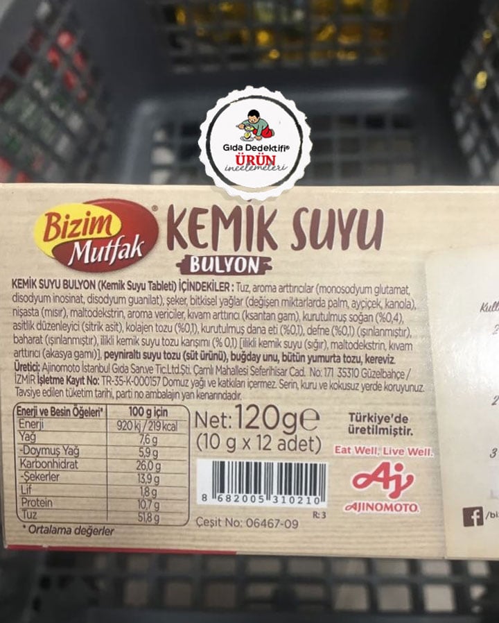 Daha önce bu yılın Şubat aylarında incelediğimiz Ajinomoto firması tarafından üretilen Bizim Mutfak Kemik Suyu Bulyon ürününü yenilenen içeriğiyle yeniden inceliyoruz. Ürün 120 gr.’lık paketlerde satılıyor ve paketten 12 adet 10 gr.’lık bulyon tabletler çıkıyor. Ürün içeriğinde dikkat çeken en büyük değişiklik geçen aylarda %0,02 yani onbinde 2 oranında yer alan kemik suyu ekstraktı yerine, %0,1 yani binde 1 oranında ilikli kemik suyu karışımı değişikliği olmuş. Fakat %0,1 oranında ürüne eklenen kemik suyu karışımında kemik suyunun yanında maltodesktrin ve kıvam arttırıcı gibi bileşenler bulunuyor. Yani üründe binde 1 oranında değil, bu orandan daha az miktarda kemik suyu bulunduğunu söyleyebiliriz.