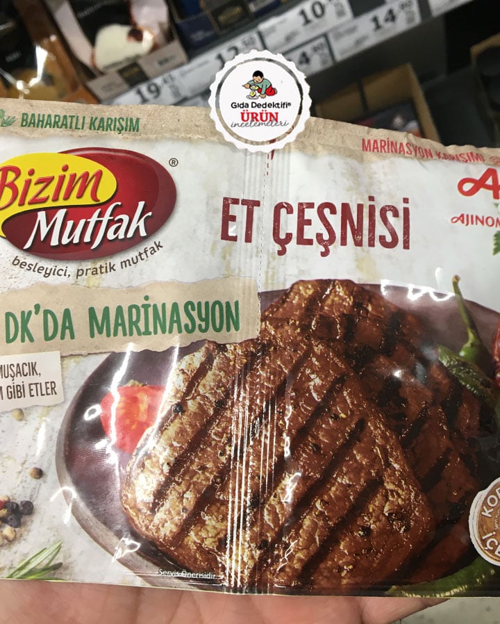 Ajinomoto firması tarafından Türkiye’de üretilerek satışa sunulan Bizim Mutfak Et Çeşnisi ürününü inceleyeceğiz. Ürün 32 gr’lık paketlerde satışa sunuluyor. Paketin 17 gr’lık kısmı marinasyon karışımı ve 15 gr’lık kısmı baharat karışımı içeriyor. Bu iki karışım yaklaşık 750 gr’lık az ya da orta yağlı dana eti için kullanım önerisiyle sunuluyor.