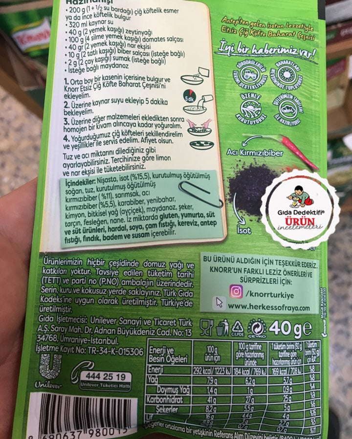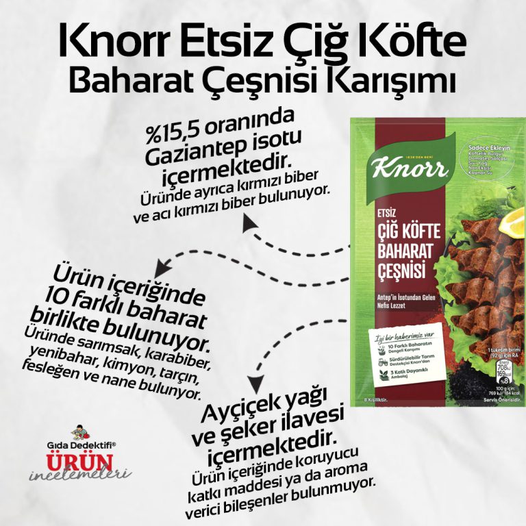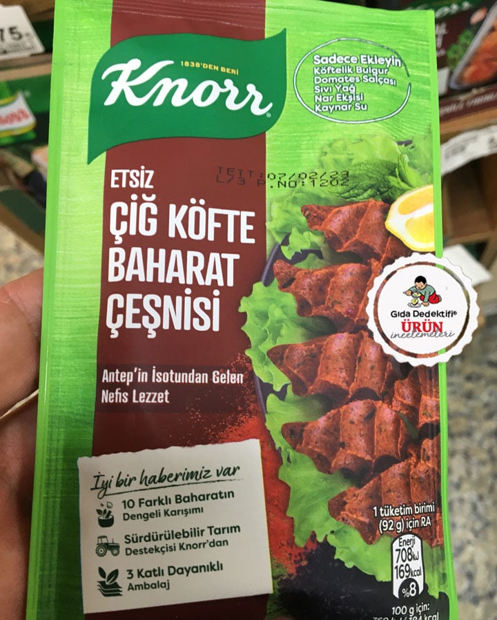 Üzerinde çiğ köfte görselleriyle dikkat çeken ve hazır çorbaları ve çeşni ürünleriyle bilinen Knorr markasıyla satışa sunulan Etsiz Çiğ Köfte Baharat Çeşnisi içeriğini inceleyeceğiz. Ürün 40 gr.’lık paketlerde satılıyor. Ürün ambalajının ön yüzünde “10 farklı baharatın dengeli karışımı”, “Antep’in isotundan gelen nefis lezzet” ifadeleri yer alıyor. Elbette burada bir düzeltme yapmak gerekiyor. Antep değil, Gaziantep diyerek ürünü incelemeye başlıyoruz.
