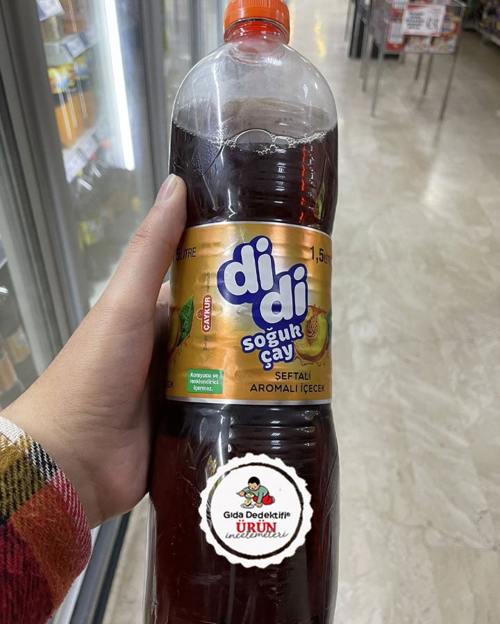 Market raflarında Şeftali çeşidinin yanı sıra, çilek ve limon aromalı çeşitleri de bulunan Çaykur markalı Didi Soğuk Çay ürününü inceleyeceğiz. Ürün aslında yasal olarak çay değil, şeftali aromalı gazsız içecek olarak sınıflandırılıyor. Ürün ambalajında “Koruyucu ve Renklendirici içermez” ifadesine rağmen bazı etiket beyanlarında Koruyucu olarak Potasyum Sorbat ve Sodyum Benzoat içermesi sebebiyle geçtiğimiz hafta Gıda Dedektifi paylaşımlarına çokça konu olmuştu. Didi markası sosyal medya üzerinden tarafımıza yaptığı açıklamada “ürün etiketlerinde bir hata olduğunu ve 1,5 litrelik Çaykur Didi markalı ürünlerin koruyucu katkı maddesi içermediğini” beyan ederek bu konuda bir düzeltme yapmamız talebinde bulunmuştu. Biz de bu beyanı esas alarak sizlere şeftali aromalı ürünü inceliyoruz.