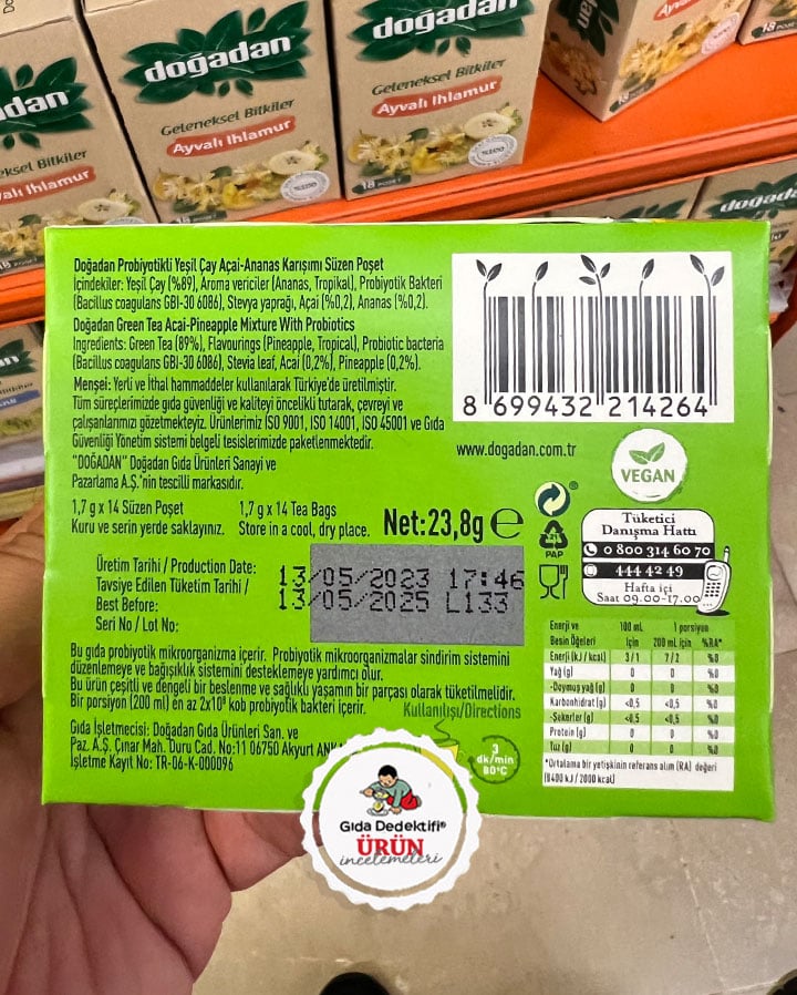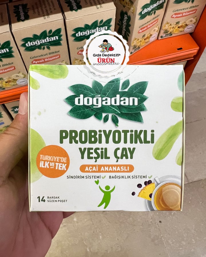 Doğadan markasıyla satışa sunulan Probiyotikli çaylardan Açai ve Ananaslı ürünü inceleyeceğiz. Fakat ürüne ne denli “açaili” ve “ananaslı” denir, onun kararını size bırakıyoruz. Ürün içeriğinde 1,7 gr’lık 14 adet süzen poşet bulunan 23,8 gr’lık kutularda satışa sunuluyor. Ürün ambalajında “sindirim sistemi” ve “bağışıklık sistemi” ifadelerinin yanında “tik” ibaresi yer alırken, ayrıca ananas ve açai meyvesi görselleri bulunuyor.