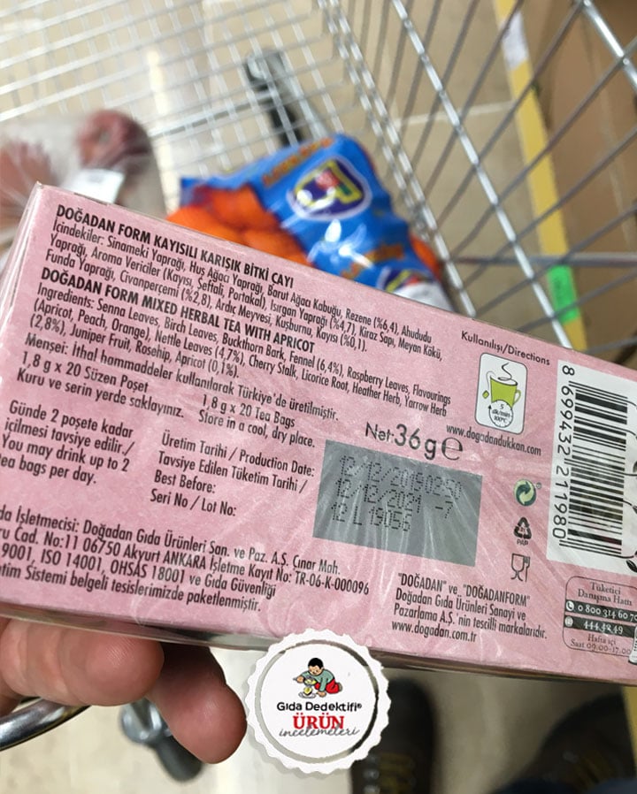 Market reyonlarında birçok farklı çeşidiyle dikkat çeken bitki çaylarından birini inceleyeceğiz: Doğadan Form Kayısılı Karışık Bitki Çayı. Ürün 20 poşet halinde 36 gr.’lık ambalajlarda satılıyor. Ambalaj üzerinde “ithal hammaddeler kullanılarak Türkiye’de üretilmiştir” ifadesi yer alıyor. Bu haliyle üründe yer alan bitkilerin tamamının ithal hammaddeler olduğunu anlamamıza rağmen hangi ülkelerden ithal edildiğini tüketici bilmiyor.