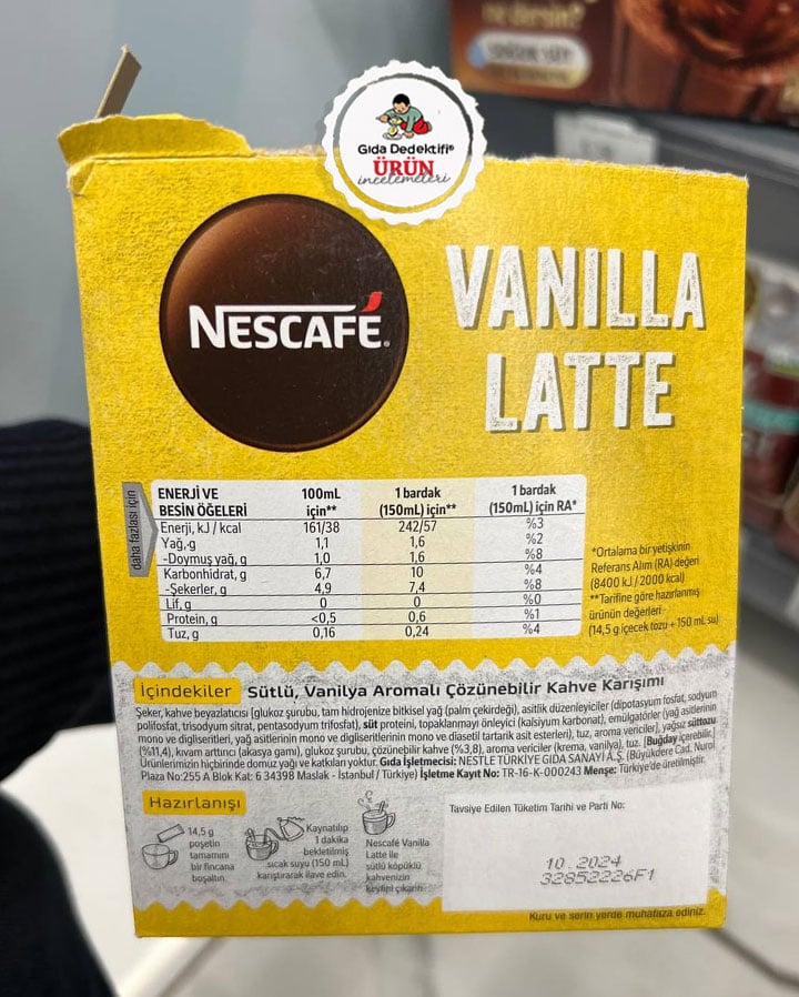 Uzun yıllardır satışa sunulan Nescafe 3’ü1 arada hazır kahve karışımlarının yanında, talep sonrasında son dönemde farklı kahve karışımlarını da piyasaya süren Nescafé markalı Vanilla Latte ürününü inceleyeceğiz. Ürün Bursa’da Karacabey’deki Nestlé Türkiye tesislerinde üretiliyor. Ürün 14,5 gr’lık tek kullanımlık kahve karışımı olarak satışa sunuluyor.