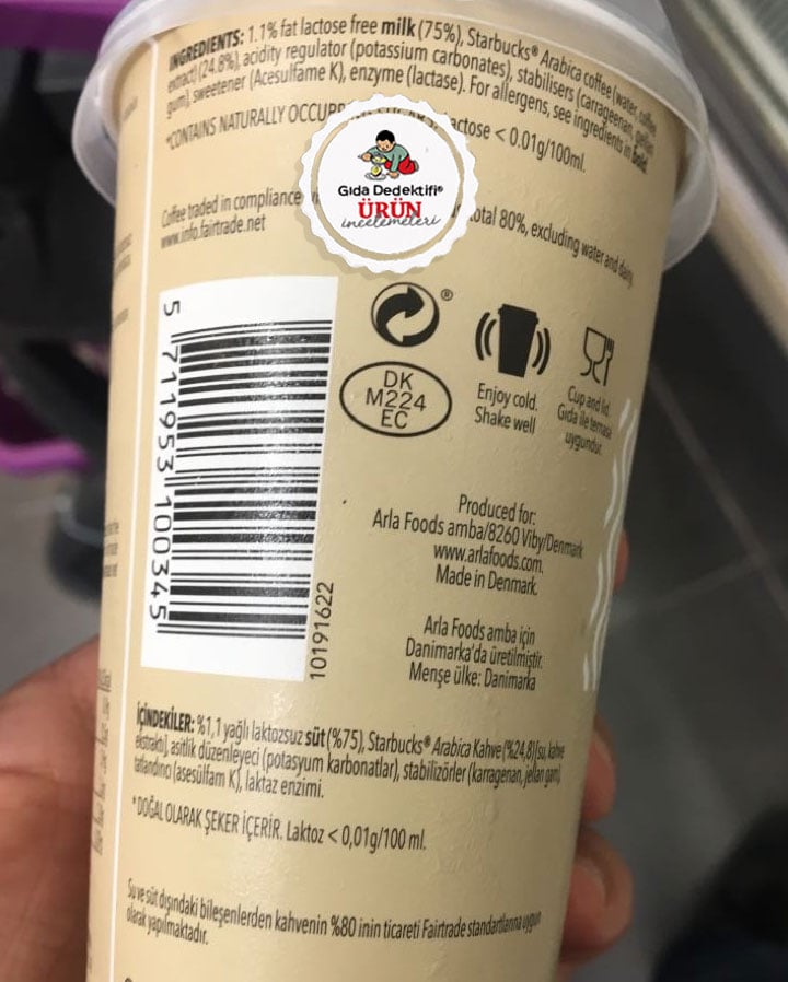🔎İçindekiler: %1,1 yağlı Laktozsuz Süt (%75), Starbucks Arabica Kahve (%24,8) [Su, Kahve ekstraktı], Asitlik Düzenleyici (Potasyum Karbonatlar), Stabilizörler (Karragenan, Jellan Gam), Tatlandırıcı (Asesülfam Potasyum), Laktaz enzimi