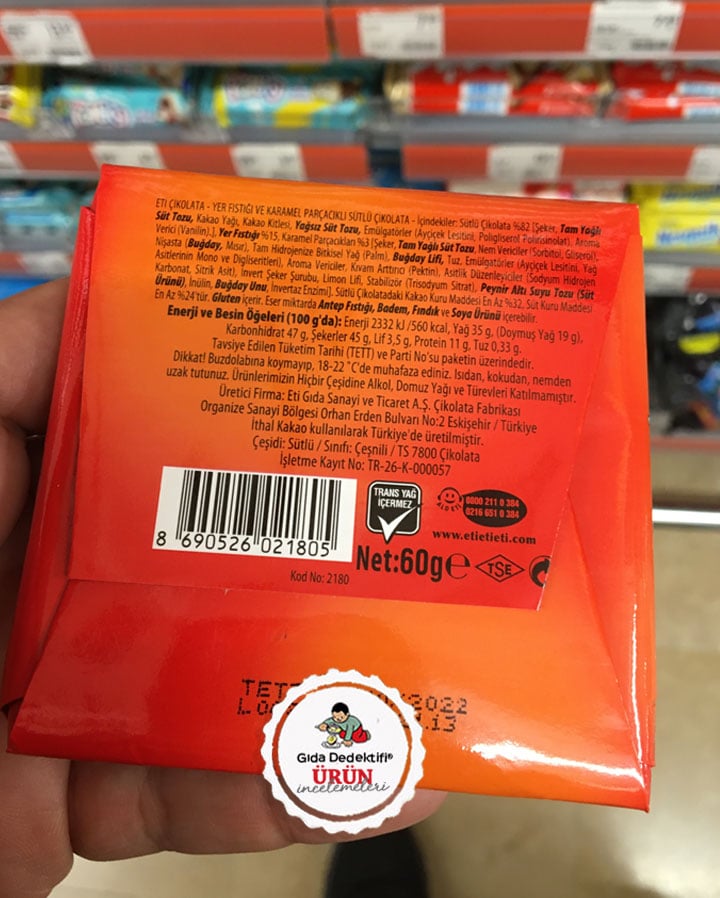🔍İçindekiler: Sütlü Çikolata (%82) [Şeker, Tam yağlı süttozu, Kakao yağı, Kakao kitlesi, Yağsız süttozu, Emülgatörler (Ayçiçek lesitini, Poligliserol Polirisinoleat), Aroma verici (Vanilin)], Yer fıstığı (%15), Karamel parçacıkları (%3) [Şeker, Tam yağlı süttozu, Nem vericiler (Sorbitol, Gliserol), Nişasta (Buğday, Mısır), Tam hidrojenize Bitkisel yağ (Palm), Buğday lifi, Tuz, Emülgatörler (Ayçiçek lesitini, Yağ asitlerinin mono ve digliseritleri), Aroma vericiler, Kıvam arttırıcı (Pektin), Asitlik Düzenleyiciler (Sodyum hidrojen karbonat, Sitrik asit), İnvert şeker şurubu, Limon lifi, Stabilizör (Trisodyum Sitrat), Peyniraltı suyu tozu, İnülin, Buğday unu, İntervaz enzimi]